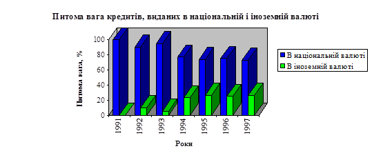 можна зробити висновок, що з плином часу питома вага кредитів, виданих в національній валюті зменшується, а в іноземній зростає. Це можна пояснити нестабільністю національної валюти і недовірою до неї з боку українських банкірів.
