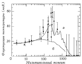 Рис. 2. Спектр неоднородностей (анизотропии) реликтового излучения: по оси абсцисс – мультипольный момент, по оси ординат – температурные флуктуации; точки с погрешностями – экспериментальные данные, кривые – результаты расчета по инфляционной модели (а) и модели топологических дефектов (б)