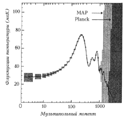 Рис. 3. Тот же спектр анизотропии реликтового излучения, как он будет измерен в экспериментах МАР и Planck для модели плоской Вселенной с определенным набором космологических параметров