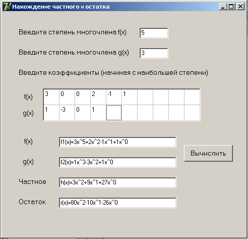 3. составить программы для нахождения частного и остатка при делении многочленов, наибольшего общего делителя двух многочленов, производной многочлена; разложения многочленов на кратные множители.