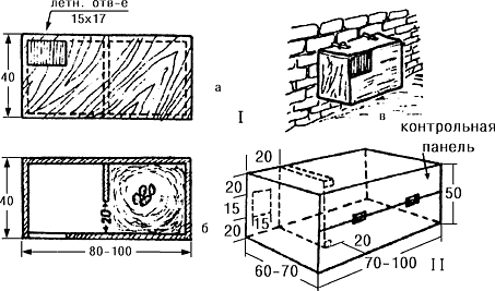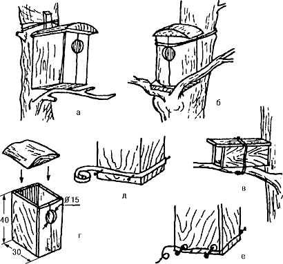 Существует множество различных вариантов искусственных гнездовий для дуплогнездников. Некоторые наиболее распространен ные из них вы видите на рисунках. Конкретный вид домика зависит от возможностей, наличного материала и вашей фантазии. Мы не будем детально описывать каждое из гнездовий, остановимся лишь на некоторых общих принципах их построения и особенностях определенных видов птиц.