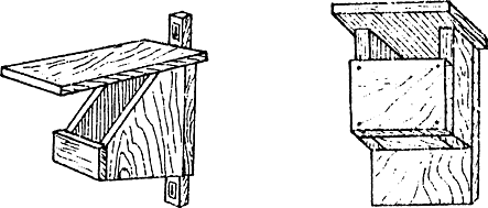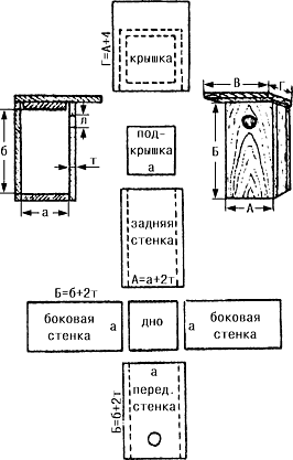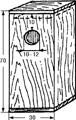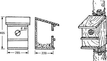 При отсутствии больших досок гнездовье можно сделать и из тарного ящика, необходимо лишь плотно подгонять дощечки, чтобы не было щелей в стенках. Поверхность доски, которая пойдет внутрь, строгать нельзя ни в коем случае, потому что птицы вылезают из домика, цепляясь коготками за стенки жилища, кормят птенцов, повиснув на них. По гладкой же поверхности лапки скользят, и птицы избегают селиться в таких гнездовьях. Сколачивать домик необходимо так, чтобы не было щелей между стенками. Крышку лучше делать съемной для наблюдения и очистки гнездовья. Для этого к нижней части крышки прибивают втулку таких размеров как дно, на которой крышка будет держаться. Втулку можно делать и не сплошную, а из двух планок, размещенных либо параллельно возле противоположных стенок, либо под прямым углом возле соседних. Прибивая планки, необходимо разместить их так, чтобы крышка не смещалась туда-сюда. Желательно ее также прикрепить чем-нибудь к стенкам. Проще всего сделать это при помощи проволочных петель. Для этого сверху одной из боковых стенок и на соответствующем ребре крышки забиваются по два гвоздика. Их загибают, чтобы образовались ушки, и соединяют гибкой проволокой - медной или алюминиевой. Одна или две пары таких ушек делаются и на противоположной стороне. Дальше из плотной стальной проволоки делают крючки. Сверху их прикручивают к ушкам, а снизу загибают и вставляют в нижние ушки. Образуются своеобраз ные крючки, которые крепко удерживают крышку и легко открываются. Можно сделать и боковую стенку, которая открывается, но это сложнее, Да и труднее избежать щелей.