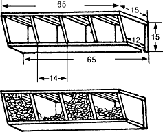 К.Н. Благосклонов предложил полуоткры тое гнездовье для городских ласточек. У него есть задняя, нижняя и верхняя стенки и перегород ка, образующая две <комнатки> для гнезд. Таких перегородок можно сделать и больше, соответственно удлинив гнездовье. Его внутренняя ширина 15 см, высота 13 см.