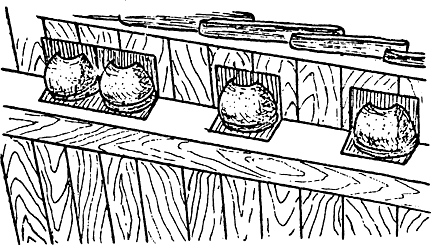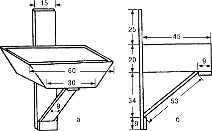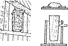 Удобные различные варианты кормушек-автоматов, в которых пища высыпается постепенно по мере ее потребления. Для этого кормовую смесь засыпают в бутылку, которую потом переворачивают кверху, или делают конический <бункер> из досок с узкой щелью внизу.
