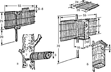 Синичник (а) и скворечник (б) из соломенных или камышовых матов (pазмеры в см).