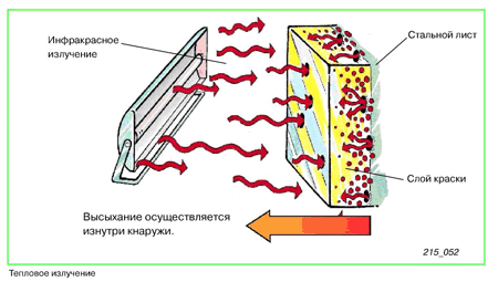 Процесс сушки при применении инфракрасной сушильной установки происходит посредством теплового излучения, а в сушильной камере посредством подвода тепла (конвекции). Инфракрасное излучение проницает во время облучения Наиболее часто используют инфракрасную сушильную установку при сушке шпатлевки и грунта. Продолжительность паузы между отдельными операциями сокращается; нет необходимости занимать окрасочно-сушильную камеру. Таким образом, эта камера может быть использована исключительно для окончательного окрашивания и сушки (см. также рисунок на стр. 20). Виды излучения инфракрасной сушильной установки Существуют два вида инфракрасных сушильных установок: установки коротковолнового излучения установки средневолнового излучения дух и лакокрасочный слой, не нагревая его. Лишь после того, как оно нагреет стальной лист, тепло передается к слою краски. Преимущества: Процесс высыхания идет изнутри кнаружи. Время высыхания короче, чем при сушке нагретым воздухом. Необходимо учитывать следующее: Следует выдерживать время выдержки на воздухе перед включением инфракрасной сушильной установкой. Следует соблюдать положенное расстояние между сушильной установкой и окрашенной поверхностью.  В коротковолновых установках излучение осуществляется посредством кварцевых трубок. Они излучают волны в видимом спектре и создают красный или оранжевый свет. Необходимая температура достигается в считанные секунды, а охлаждение происходит быстро. Излучение интенсивно, и время сушки поэтому невелико. В средневолновых установках излучение осуществляется посредством керамических пластин. Они излучают волны в невидимом спектре. Они работают, когда излучают тепло. Рабочая температура достигается лишь по истечению нескольких минут, охлаждение требует тоже некоторого времени. Время сушки поэтому больше, чем при использовании коротковолновых установок. Продолжительность сушки при использовании инфракрасных сушильных установок (при расстоянии от установки до окрашиваемой поверхности 80 см) Материал Продолжительность сушки Полиэфирная шпатлевка 2 минуты Напыленная шпатлевка от 2 до 7 минут Водный грунт-наполнитель от 7 до 9 минут Грунт от 3 до 8 минут Лакокрасочное покрытие от 7 до 10 минут