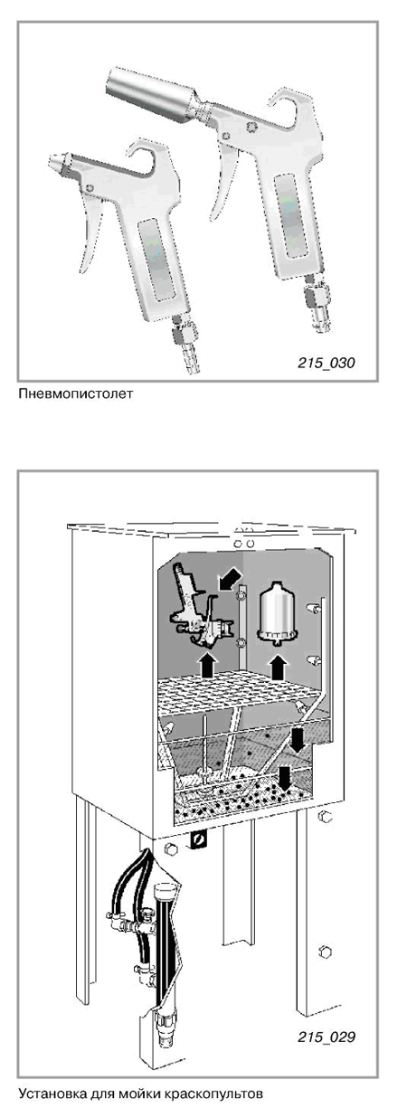 Пневмопистолет подключен к системе подачи сжатого воздуха. При помощи этого пистолета удаляют основную часть отходов шлифования с сухой отшлифованной поверхности. На конце пневмопистолета установлено мультираспылитель. Благодаря специальной конструкции такого распылителя достигается утроенная подача воздуха на поверхность при постоянном расходе сжатого воздуха вследствие использования эффекта подсоса воздуха. Пылеудалительные салфетки Такие салфетки особенно хорошо удаляют пыль с поверхности, так как они пропитаны клейкой смолой. Очистка поверхности при помощи таких салфеток производится непосредственно перед окрашиванием. Установка для мойки краскопультов Краскопульты, шпатели, распылители, линейки и т. п. очищаются с использованием универсальных чистящих средств или растворителей. Установка для мойки краскопультов представляет собой герметичную камеру. В эту камеру помещают загрязненный инструмент и оборудование. После закрытия дверцы включается насос с пневмоприводом, которые подает растворитель внутрь камеры. После истечения определенного времени или при открытии дверцы насос отключается.