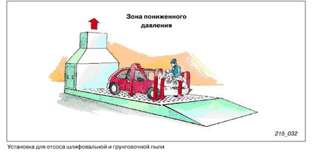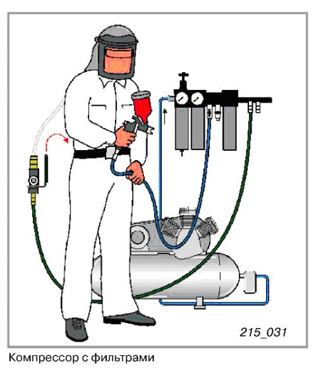 Поскольку краска наносится при помощи сжатого воздуха, окрасочный цех должен быть оборудован компрессором, который подает достаточное количество воздуха под требуемым давлением. Компрессор должен быть оборудован влаго- и маслоотделителем. Фильтр и регулировочный манометр Сжатый воздух, подводимый к пневмопистолетам и краскопультам, должен быть очищен от твердых частиц, жира, масел и воды. Частицы размером более 0,01 микрона должны быть задержаны. Давление воздуха следует изменять в зависимости от распыляемого материала. Поэтому должен быть предусмотрен кран с манометром для регулирования давления. Установки для отсоса шлифовальной и грунтовочной пыли Эти установки размещаются в зоне проведения подготовительных, грунтовочных и шлифовальных работ. Они установлены в полу.