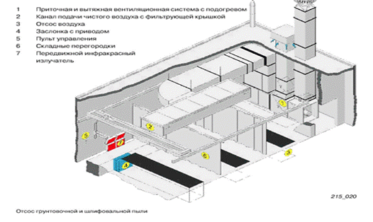 Для быстрого высыхания и отвердения краски необходимо применять соответствующее оборудование. Окрасочно-сушильная камера Она представляет собой комбинацию из окрасочной и сушильной камер. В сушильной камере температура поднимается приблизительно до 60° С путем нагревания воздуха. Такая температура ускоряет протекание химических реакций и испарение содержащихся в слое краски растворителя и разжижителя. Повышение температуры должно осуществляться ступенчато. Это в сушильной камере обеспечивается посредством автоматическом управление.