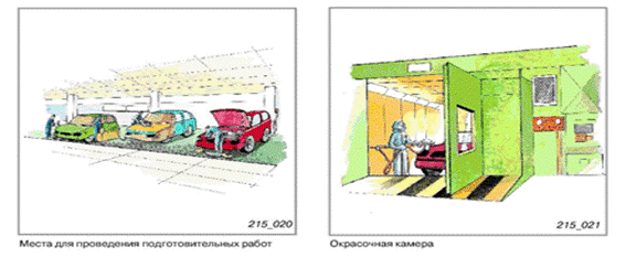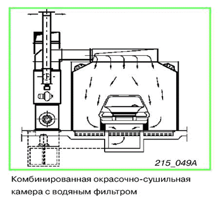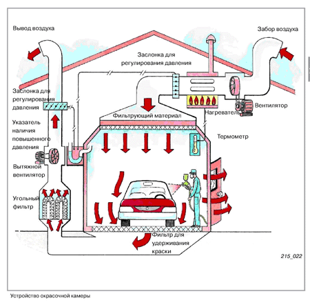 Осуществление окраски в окрасочной камере является непременным условием получения высококачественного лакокрасочного покрытия. Для нормальной работы окрасочной камеры и получения высококачественного лакокрасочного покрытия обязательно регулярное проведение работ по техническому обслуживанию и уходу за камерой. Окрасочная камера представляет собой закрытое помещение, в которое помещают автомобиль или панель кузова для окрашивания. В камере предусмотрена вертикальная, сверху вниз, циркуляция воздуха, которая отводит распыленную в воздухе краску. Воздух, нагретый до соответствующей температуры, сверху через фильтровальную потолочную крышку поступает в камеру, Воздух обтекает автомобиль или кузовную деталь и отсасывается в зоне размещения ног, далее проходя через фильтр, задерживающий краску. Потолочный и нижний фильтры следует заменять с периодичностью в зависимости от длительности работы окрасочной камеры. Во избежание попадания краски в атмосферу отсасываемый воздух проход через фильтры с активированным углем. Эти фильтры также следует заменять с периодичностью в зависимости от длительности работы окрасочной камеры. Работы по техническому обслуживания и уходу за окрасочной камерой включают в себя: смену фильтров, очистку стен и светильников, обслуживание электродвигателей, нагревателей и прочего встроенного оборудования. Количество подаваемого в камеру воздуха несколько больше, чем количество отсасываемого воздуха. Поэтому в камере несколько повышенное давление, которое постоянно поддерживается на одном уровне вследствие утечки воздуха через неплотности и щели в дверном проеме. Если бы не было этого повышенного давления, то нефильтрованный наружный воздух мог поступать в камеру, что негативно отражалось бы на качестве лакокрасочного покрытия. На скосах боковых стенок камеры, а по возможности и по бокам ее расположены светильники, которые дают равномерное освещение по всему периметру камеры. Чаще всего используются комбинированные окрасочно-сушильные камеры с расположенной сбоку сушильной камерой. Чисто окрасочные или сушильные камеры менее производительны, поэтому их применяют при небольших объемах работ.