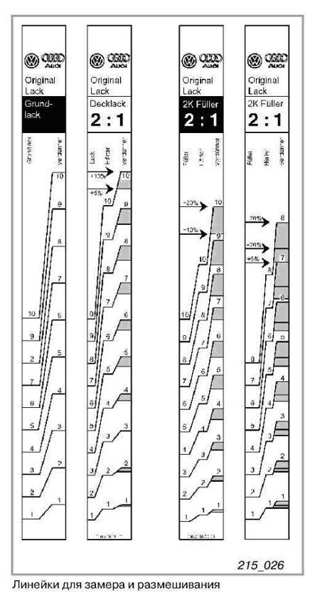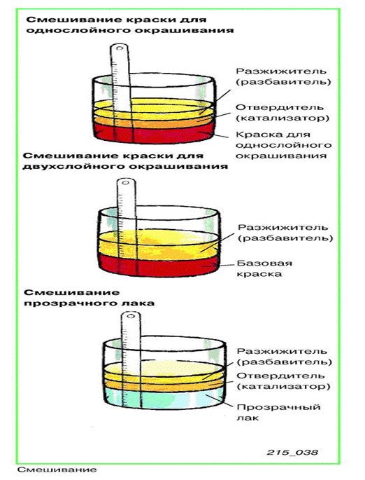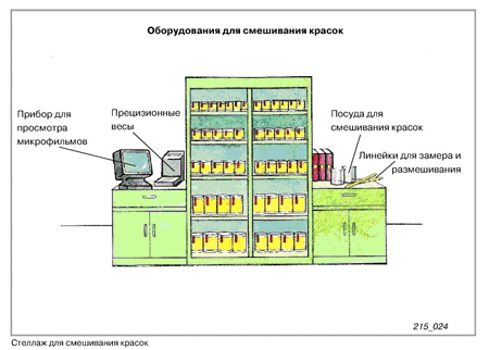 Для правильного подбора краски и дозировки отвердителя и разжижителя необходимо следующее оборудование: стеллаж с красками прибор для просмотра микрофильмов прецизионные весы компьютерные весы мерные линейки и аналогичные измерительные приборы Стеллаж для смешивания красок На стеллаже для красок установлены емкости с различными красками. Каждая емкость имеет специальную крышку с мешалкой. При помощи ее краску размешивают и отмеряют нужное количество. При хранении краски имеют склонность к снижению однородности их состава. Поэтому необходимо перед употреблением краску тщательно перемешать для достижения однородного состава.