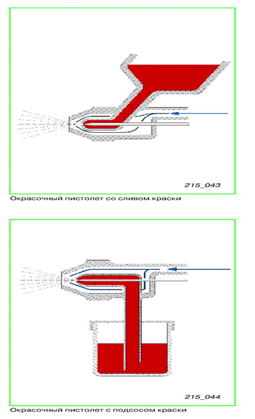 При применении окрасочных пистолетов (краскопультов) можно получить абсолютно ровный слой краски с глянцевой поверхностью. Окрасочный пистолет является главным инструментом при окончательном окрашивании. Регулярный уход за пистолетом, мойка и очистка его после каждого окрашивания и бережное обращение с ним являются непременным условием качественного окрашивания. Действие окрасочного пистолета Под действием потока воздуха вследствие специальной конструкции пистолета краска поступает из бачка (принцип Вентури) и затем распыляется из распылителя. Если бачок расположен над пистолетом, то тогда пистолет со сливом краски из бачка, если под пистолетом — пистолет с подсосом краски из бачка. При поджатии курка пистолета до первого фиксированного положения открывается только проход сжатого воздуха. Если курок поджат больше, сдвигается игла распылителя и краска увлекается потоком воздуха с высокой скоростью. Благодаря этому возникает конус распыла, состоящий из микрокапель краски. Величину капель определяет давление воздуха: выше давление = капли меньше;