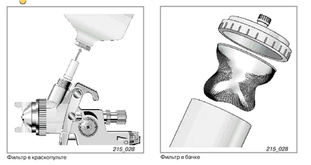 Смешанная краска или наполнитель должны не иметь инородных частиц. Взвеси задерживаются фильтром для краски для того, чтобы не был забит краскопульт и инородные частицы не попали на лакокрасочное покрытие. Такие фильтры установлены в краскопульте и в его бачке.