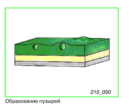 При слишком быстром повышении температуры высыхает сначала поверхностный слой краски (образование плотной корки). Поэтому пары растворителя не могут выйти в атмосферу. Следствием этого является образование пузырей. После нанесения лакокрасочного покрытия следует подождать примерно 10 минут для того, чтобы летучие фракции растворителя могли выйти в атмосферу.