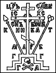 Надписи и криптограммы на Русских крестах всегда были гораздо разнообразнее, чем на Греческих. С XI века под нижней косой перекладиной восьмиконечного креста появляется символическое изображение головы Адама, погребенного по преданию на Голгофе (по-евр.