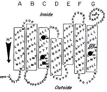 Модель БР в элементах вторичной структуры. Выделены аминокислоты, участвующие в протонном транспорте: кружками остатки аспарагиновой кислоты, квадратом остаток аргинина. С Lys-216 (К-216) образуется основание Шиффа (SB). Стрелкой показано направление протонного транспорта.