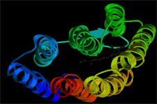 Бактериородопсин - ретиналь-содержащий генератор протонного транспорта представляет собой трансмембранный белок в 248 аминокислот с молекулярным весом 26 кДа, пронизывающий мембрану в виде семи a-спиралей; N- и C-концы полипептидной цепи находятся по разные стороны цитоплазматической мембраны: N-конец обращен наружу, а C-конец - внутрь клетки (рис.1, 2).