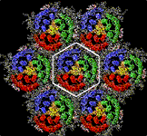 в виде пурпурных мембран (ПМ), образующих двумерные кристаллы с гексагональной решеткой. Эти участки содержат сам белок, некоторые липиды, каротиноиды и воду (рис.3). Обычно они имеют овальную или круглую форму со средним диаметром около 0,5 мкм и содержат около 25 % липидов и 75 % белка (Oesterhelt D., Stoeckenius W., 1974). ПМ устойчивы к солнечному свету, воздействию кислорода, температуре более чем 80ºC (в воде) и до 140ºC (сухие), рН от 0 до 12, высокой ионной силе (3 М NaCl), действию большинства протеаз, чувствительны к смесям полярных органических растворителей с водой, но устойчивы к неполярным растворителям типа гексана. Большое практическое значение имеет существующая возможность встраивания ПМ в полимерные матрицы без потери фотохимических свойств.