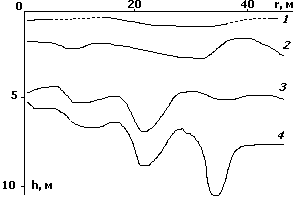 Граница 1 на разрезе соответствует глубине сезонногопромерзания рыхлых отложений на период наблюдений. Границами 2 и 3 выделяется водоносный горизонт ( 2 – поверхность, 3 – подошва водоносного горизонта). Поверхности плотика соответствует граница 4 (см. рис.). Выявлено два провала в плотике, которые проинтерпретированы как карстовые полости. Геометрические параметры карстовых полостей: диаметр 3 м, глубина относительно поверхности плотика 6 м. Кроме двух указанных карстовых полостей выявлены также три участка отсутствия отражения радиоимпульсов протяженностью 2,5 м, 3 м и 4,5 м. Природа этих зон невыяснена. Либо это закарстованные участки, либо не зеркальные для радиоволн эффективной частоты проникновения участки поверхности плотика.