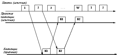 Во втором методе для повышения коэффициента использования линии источнику разрешается передать некоторое количество кадров в непрерывном режиме, то есть в максимально возможном для источника темпе, без получения на эти кадры ответных квитанций. Количество кадров, которые разрешается передавать таким образом, называется размером окна. Рисунок 6.2 иллюстрирует данный метод для размера окна в W кадров. Обычно кадры при обмене нумеруются циклически, от 1 до W. При отправке кадра с номером 1 источнику разрешается передать еще W-1 кадров до получения квитанции на кадр 1. Если же за это время квитанция на кадр 1 так и не пришла, то процесс передачи приостанавливается, и по истечению некоторого тайм-аута кадр 1 считается утерянным (или квитанция на него утеряна) и он передается снова.