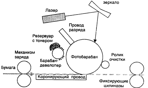 Важнейшим конструктивным элементом лазерного принтера является вращающийся фотобарабан, с помощью которого производится перенос изображения на бумагу. Фотобарабан представляет собой металлический цилиндр, покрытый тонкой пленкой из фотопроводящего полупроводника. По поверхности барабана равномерно распределяется электрический заряд. С помощью тонкой проволоки или сетки, называемой коронирующим проводом. На этот провод подается высокое напряжение, вызывающее возникновение вокруг него светящейся ионизированной области, называемой короной.