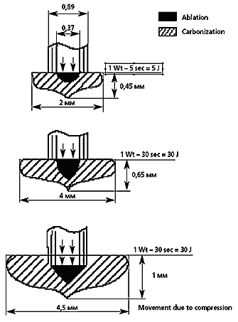 В фантомных экспериментах на различных моделях (из пластмассы разных цветов, на стопках черной копировальной бумаги, на тканях опухоли в энуклеированных глазах) в период 1983–88 гг. [8, 25] было изучено распределение поглощаемой тепловой энергии различных лазеров в зависимости от параметров облучения. В 1995 г. возникла идея на тех же моделях воспроизвести и замерить абляционный лазерный эффект [24]. Из рис. 1 можно видеть, что небольшой абляционный кратер в центре очага коагуляции независимо от дозы постоянно присутствует; с увеличением энергетической экспозиции расширяются оба очага (и коагуляционный, и в меньшей мере – абляционный). Чтобы усилить абляционное воздействие по глубине, требовалось применить легкую компрессию с помощью торца стекло–волоконного лазерного наконечника.