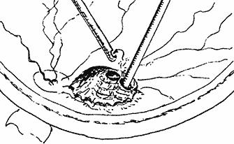 Техника вмешательства была следующей. В традиционных для витреальной хирургии “косых” меридианах через склеру в проекции плоской части ресничного тела в полость глаза вводили витреофаг и стекловолоконный наконечник световода для диодного лазера фирмы “Милон” (С.Е. Гончаров с соавт.). Все манипуляции в полости глаза проводили под контролем операционного микроскопа с конфокальным освещением при использовании хирургической контактной линзы.