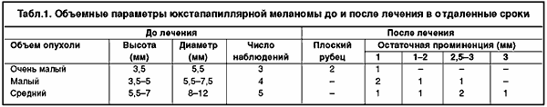 Опыт лечения 122 больных со сроками наблюдения от 4 до 12 лет по материалам Я.Л. Кулакова, показал, что при толщине опухоли 3–5 мм и диаметре основания 10–15 мм удалось полностью ее разрушить в 61 случае из 73, а при толщине более 5 мм и диаметре основания более 15 мм – в 24 из 49 (в остальных отмечен продолженный рост).