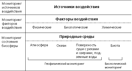Таким образом, в систему экологического мониторинга входят наблюдения за состоянием элементов биосферы и наблюдения за источниками и факторами антропогенного воздействия.