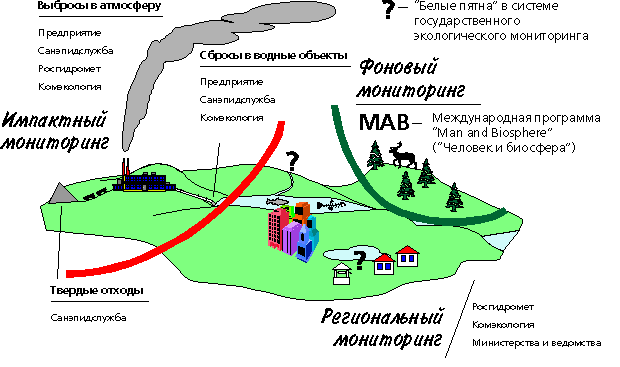 Программа импактного мониторинга может быть направлена, например, на изучение сбросов или выбросов конкретного предприятия. Предметом регионального мониторинга, как следует из самого его названия, является состояние окружающей среды в пределах того или иного региона. Наконец, фоновый мониторинг, осуществляемый в рамках международной программы "Человек и биосфера", имеет целью зафиксировать фоновое состояние окружающей среды, что необходимо для дальнейших оценок уровней антропогенного воздействия.