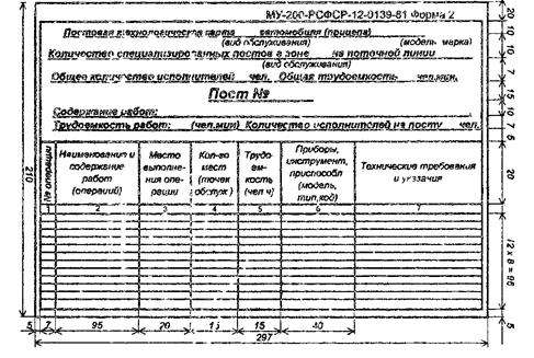 Постовая технологическая карта отражает последовательность операций ТО (диагностики) по агрегатам (агрегату) или системам (системе), которые выполняются на одном из постов ТО (диагностики). В соответствии с требованиями [6] постовая технологическая карта выполняется на формах 2 или 2а МУ-200-РСФСР-12-0139-81 (Приложения 13 и 14 Методических указаний).