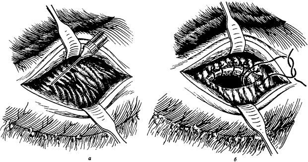 а, циркулярно пришивают к париетальной брюшине и к коже, а затем помещают в полость кисты дренаж и марлевые тампоны. Таким образом киста опорожняется наружу.