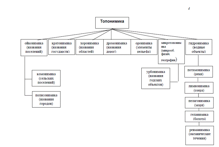 Как было сказано выше, что в настоящее время отсутствует единая универсальная классификации, которая охватывала бы все проблемы топонимики, это можно объяснить тем, что топонимика еще развивается как наука. Общеупотребляемая классификация топонимики представлена на рис. 1.