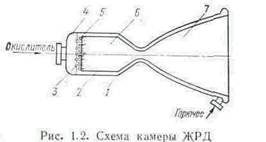 Основной агрегат ЖРД, где создается тяга, — КС двигателя. На рис. 1.2 приведена камера ЖРД, работающая на двухкомпонентном топливе. Она состоит из камеры сгорания 6