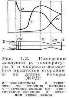 топлива и газов по длине камеры ЖРД изображен на рис. 1.3. Высокие термо- и газодинамические параметры (давление, температура, скорость) газа, а также коррозионное и эрозионное воздействие ПС на стенку камеры создают чрезвычайно тяжелые условия ее работы. Обычно для надежной работы камеры помимо интенсивного наружного (регенеративного) охлаждения применяют специальные методы защиты: пристеночную зону с пониженной температурой газа (внутреннее охлаждение), специальные термостойкие покрытия стенок и т. д. Применение внутреннего охлаждения, как правило, уменьшает удельный импульс, что невыгодно, так как снижается экономичность двигательной установки.