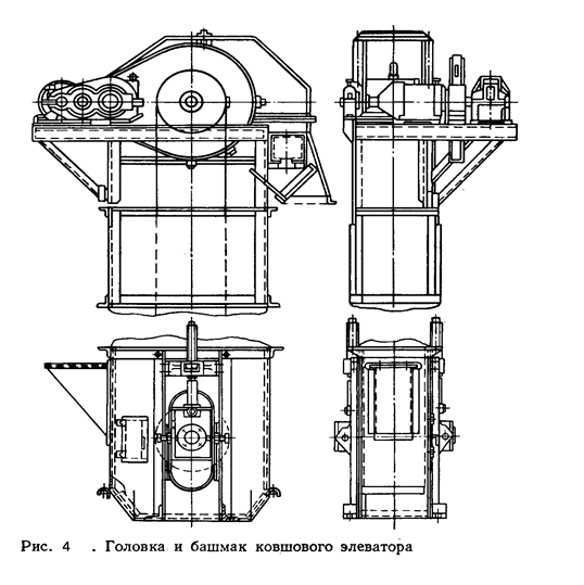 Привод. Механізм привода розміщаються на голівці — верхній частині елеватора (див. мал. 4). Барабан чи зірочки приводяться електродвигуном через двоступінчастий редуктор. При великих передаточних числах застосовують додаткову зубчасту, рідше — клиноремінну передачу.