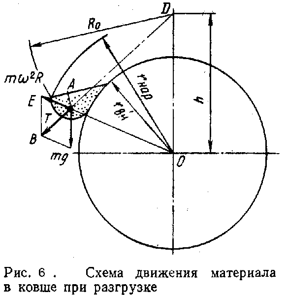 Поверхня матеріалу в ковші розташовується під кутом природного укосу в русі до нормалі, проведеної до лінії AD, і являє собою логарифмічну спіраль, обумовлену рівнянням
