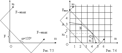 Эта зависимость на рис. 7.5 представлена в форме уравнения прямой с угловым коэффициентом x2=F-x1, из которого видно, что tga= -1. При этом угол a=135°, а величина F равна отрезку, отсекаемому прямой на оси ординат. Если прямую перемещать параллельно самой себе в направлении, указанном стрелками, то величина F будет возрастать. Совместим теперь ОДР, изображенную на рис. 7.4, с линией целевой функции F, построенной на рис. 7.5, получим рис. 7.6.