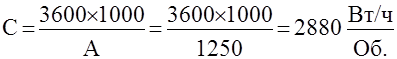 Имеем однофазный счетчик 220 В. На щитке счетчика указано передаточное число А, равное 1250 оборотов диска, при котором показания изменяются на 1 квт/ч. Определяем постоянную счетчика С, которая показывает количество израсходованной энергии за один оборот диска:
