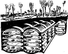 1 – подземный гараж; 2 – рампы для въезда и выезда; 3 – жилые дома