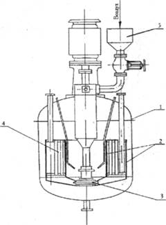 Ферментатор с самовсасывающей мешалкой непрерывного действия: 1 — корпус, 2 — диффузор, 3 — самовсасывающая мешалка. 4 — теплообменник, 5 — фильтр.