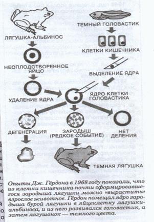 1977 год - закончилась публикация серии статей о работах профессора зоологии Оксфордского университета Дж.Гердона, в ходе которых было клонировано более полусотни лягушек. Из их икринок удалялись ядра, после чего в оставшийся "цитоплазматический мешок" пересаживалось ядро соматической клетки. Впервые в истории науки на место гаплоидного ядра яйцеклетки с одинарным набором хромосом было внесено диплоидное ядро соматической клетки с двойным числом носителей генетической информации.