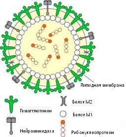 Снаружи вирус покрыт липидной оболочкой. Именно липиды ответствтенны за ту тяжелую интоксикацию, которая поражает человека во время болезни. На поверхности вируса находятся выступы (гликопротеины ) - гемагглютинин (названный по способности агглютинировать эритроциты) и нейраминидаза (фермент). Гемагглютинин обеспечивает способность вируса присоединяться к клетке. Нейраминидаза отвечает, во-первых, за способность вирусной частицы проникать в клетку-хозяина, и, во-вторых, за способность вирусных частиц выходить из клетки после размножения.