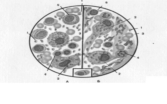 (Б) 1 лейшмания свободнолежащая, 2 лейшмании внутриклеточные, 3 эритроцит, 4 нейтрофил, 5 лимфоцит..