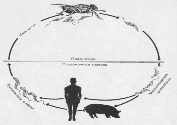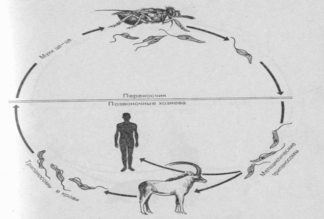 Тело трипаносом продолговатое, узкое, имеет жгутики и ундулирующую мембрану. Длина тела 17—28 мкм. Переносчиком возбудителей африканского трипаносомоза являются мухи рода Glossina, или це-це (рис.№ 7 и 8 ).