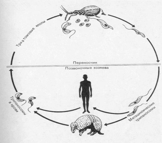 Для человека патогенны три вида из рода Trypanosoma , причем два вида вызывают африканский трипаносомоз (сонную болезнь) и один вид —американский трип аносомоз (болезнь Шагаса).