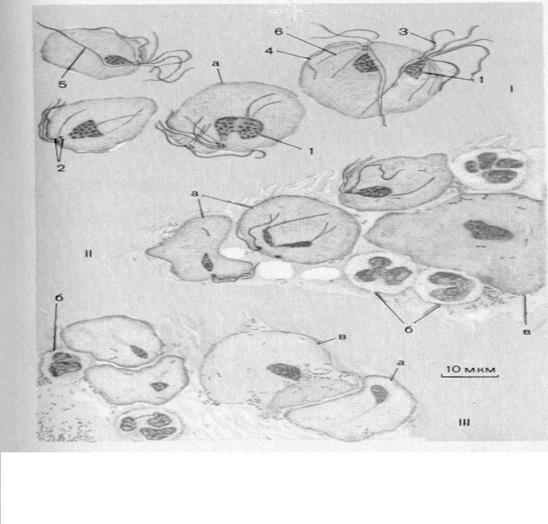 - мазок из влагалища ( окраска метиленовым синим) а- трихомонада: 1 ядро, 2 базальные тельца, 3 передние жгутики, 4 ундулирующая мембрана, 5 аксостиль, 6 парабазальная нить, 7 лейкоциты. в – эпителиальные клетки