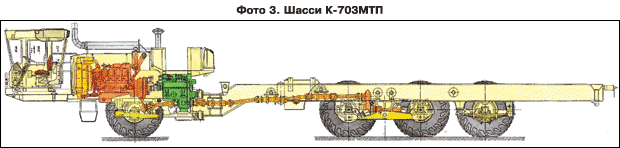Шасси К-703МТП (фото 3) представляет собой четырехосную модификацию шасси К-703МТУ. На нем установлен дизельный двигатель Тутаевского моторного завода мощностью 420 л.с. Колесная формула шасси 8х6. Три передних моста являются ведущими. Для улучшения поворачиваемости передний и средний мосты снабжены коническими дифференциалами. Четвертый мост установлен с целью увеличения несущей способности шасси и не является ведущим. Подвеска передних трех мостов балансирная, ведомый мост установлен на рессоре.