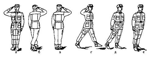 а - прикладання руки до головного убору; б - поворот кругом; в - приставлення ноги; г - крок уперед; д - опускання руки; е - приставлення ноги.
