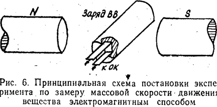 , что выше, чем проводимость полупроводников. В исходном же состояния ВВ, как правило, хорошие изоляторы. Резкое . изменение электрического сопротивления в момент прохождения детонационной волны используют для определения скорости детонация. Для этого в исследуемом заряде ВВ, на точно известном расстоянии друг от друга, располагают два или более ионизационных датчика, на которые подают определенное электрическое напряжение.. В момент прохождения детонационной волны сопротивление ионизационных датчиков резко изменяется, что вызывает скачки напряжения в согласующей электрической схеме (.формирователе импульсов), которые подаются .на регистратор промежутков времени. В качестве такого регистратора могут, использоваться хронометр, осциллограф или частотомер, С их помощью измеряется промежуток времени между моментами замыкания датчиков. Данный метод является основным методом определения скорости детонации и регламентирован ГОСТ.